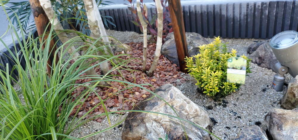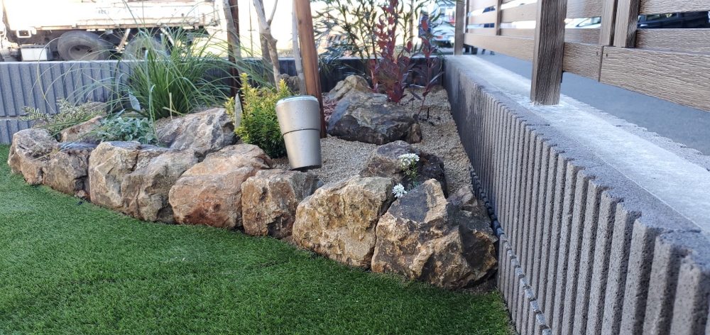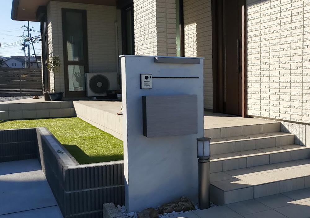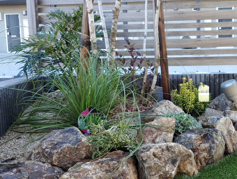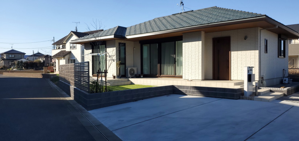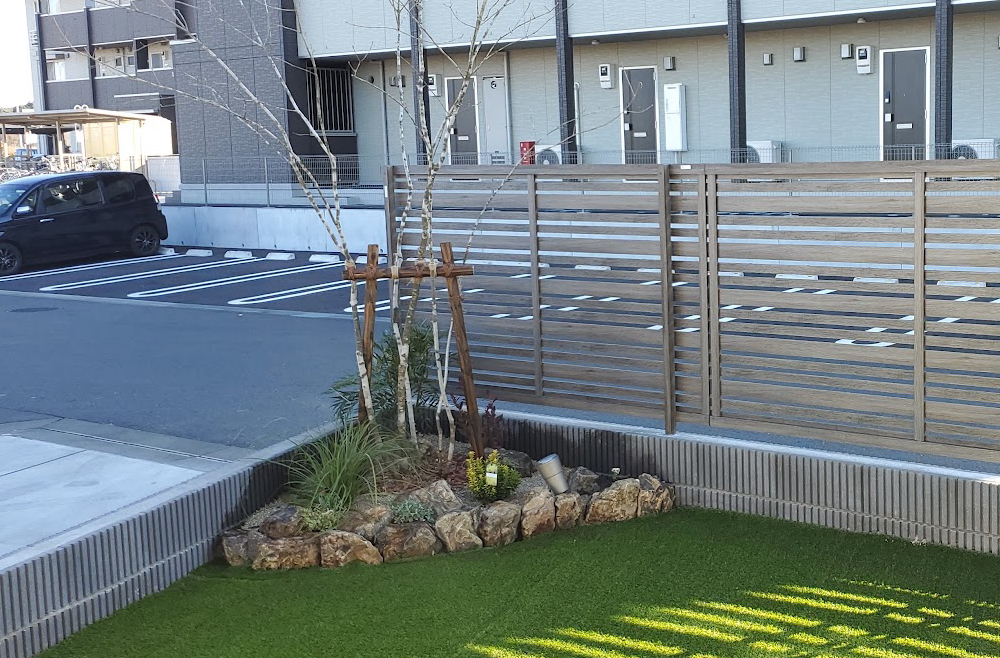 アオダモを中心に、下草とみかも石が美しいお庭が完成しました。 人工芝を敷き、植栽スペースを設けた和モダンのイメージに仕上がっています。 また、駐車スペースを4台分確保し、周囲からの視線対策として、目隠しのフェンスも設けています。