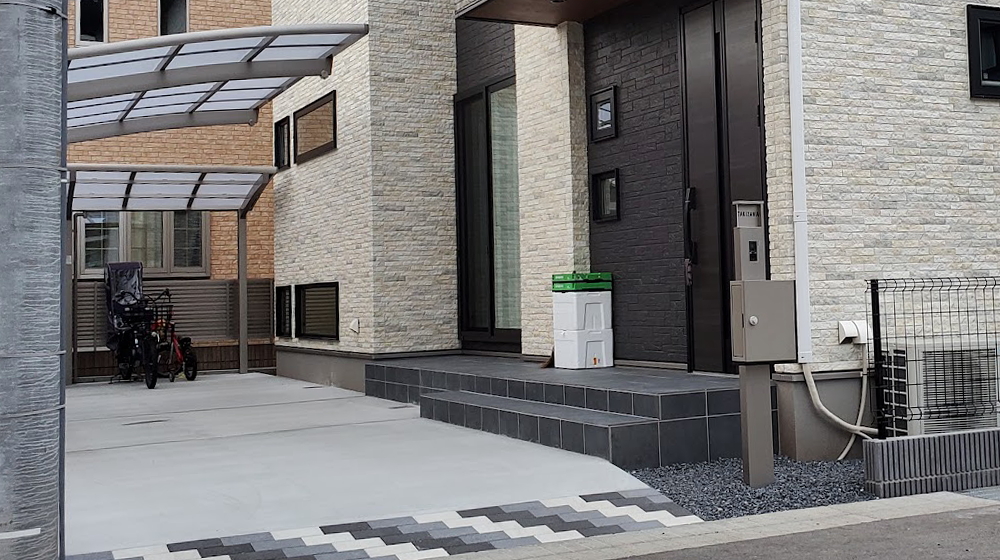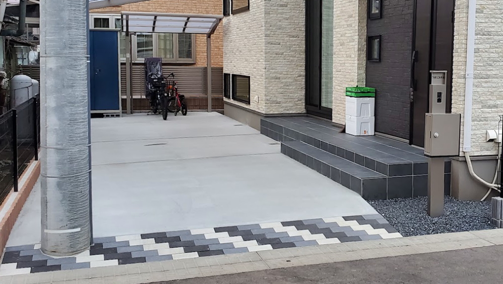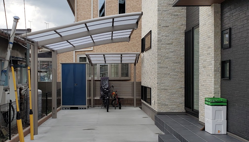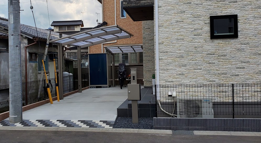 倉庫とサイクルポートとカーポートをワンセットにしたインターロッキングが美しいカースペースです。