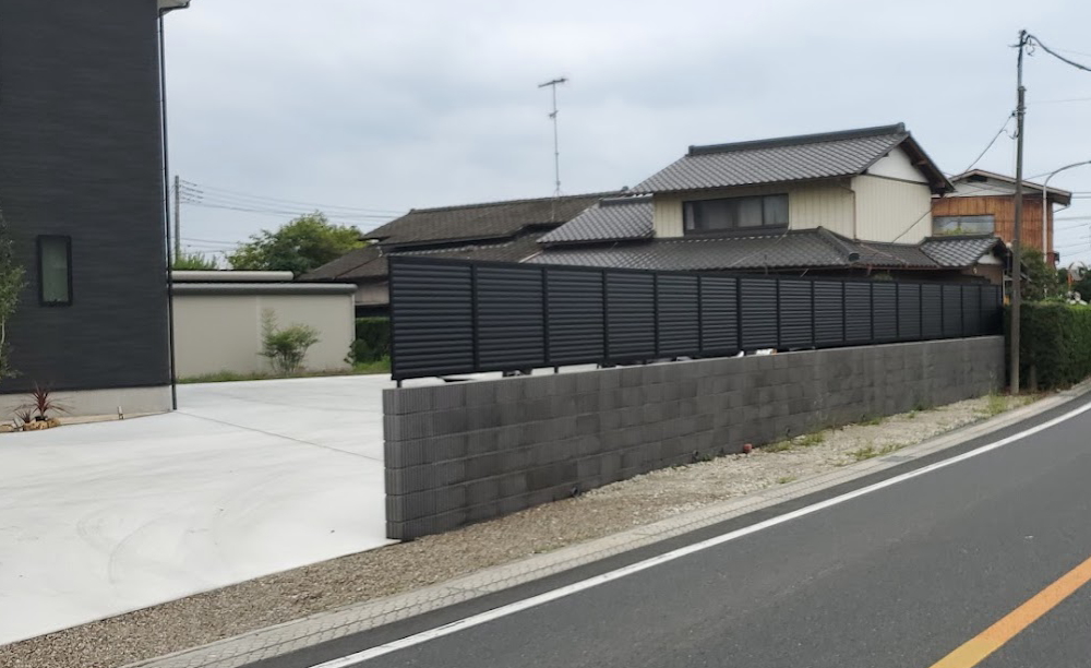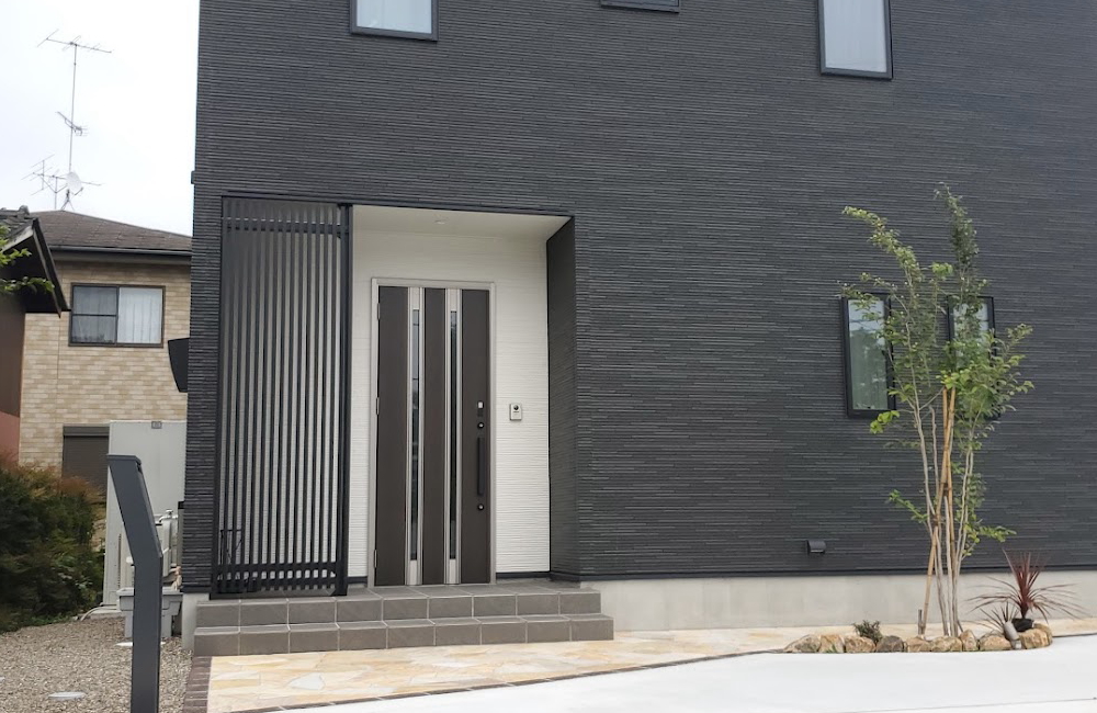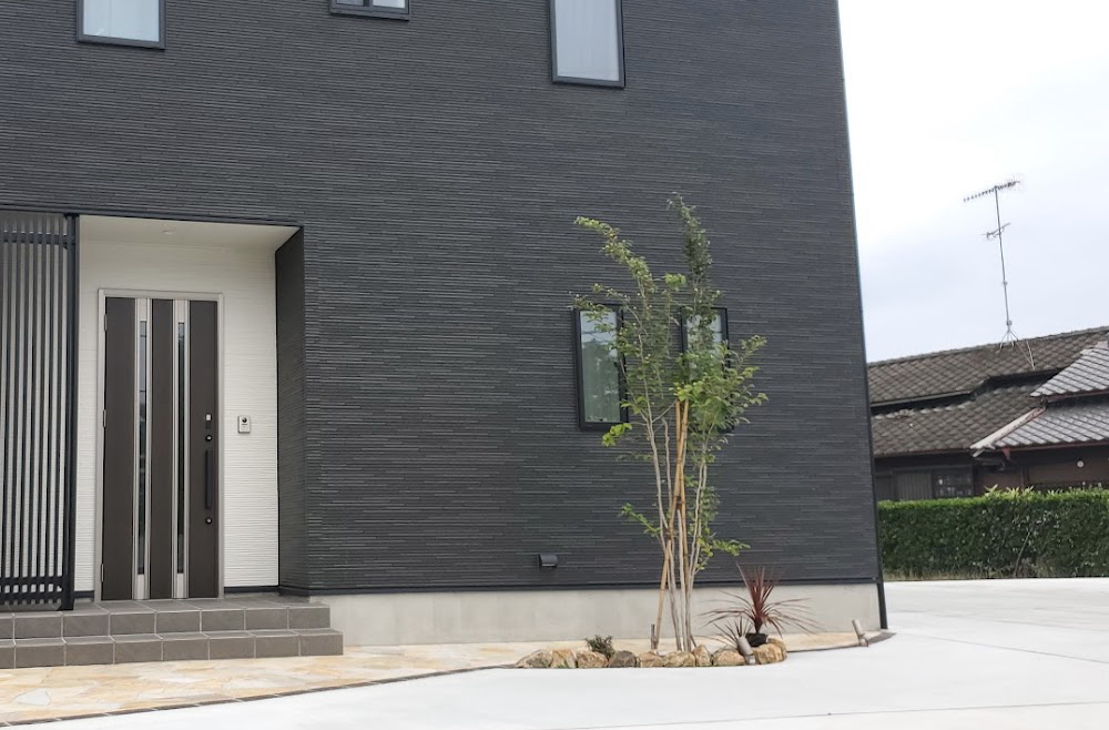 乱形石貼りと植栽が美しいお庭が完成しました。和モダンで夜のライトアップも絶景です。 大通りに面しているため、プライバシーの観点から目隠しフェンスを設置し、5台以上の大きな駐車スペースも確保しました。